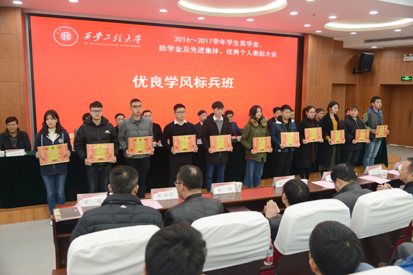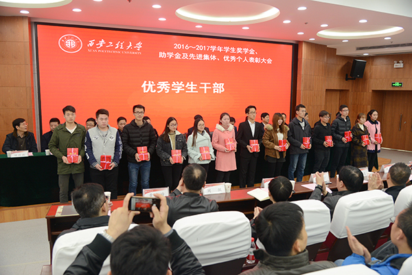 校党委副书记赵小峰宣读了《关于表彰2016~2017学年学生先进集体和优秀个人的决定》,对11个优良学风标兵班,45个先进班集体,27名“国家奖学金”获得者,591名“国家励志奖学金”获得者,15名“纺织之光奖学金”获得者,45名“桑麻奖学金”获得者,29名“理士奖学金”获得者,4名“柳棉奖学金”获得者,8名“澳蓝奖学金”获得者,8名“乌斯特奖学金”获得者,19名“百思特·立诺联合奖学金”获得者,20名“德美化工奖、助学金”获得者,36名“花式纱线专项奖学金”获得者,6名“汕头市超声仪器研究所有限公司专项奖学金”获得者,14名“武汉中科创新技术股份有限公司专项奖学金”获得者,16名优秀学生标兵,425名优秀学生,425名优秀学生干部,9名“自强之星”获得者进行了表彰。