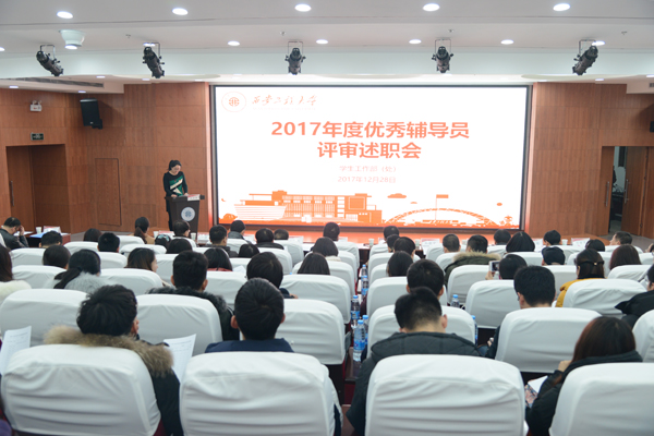 2017年12月28日上午,我校2017年度优秀辅导员评审述职大会在临潼校区图书馆一楼报告厅举行。校党委书记刘江南、校党委副书记赵小峰出席大会,校学生工作领导小组部分成员单位负责人、部分职能部门负责人、各学院学生工作主管、全体专兼职辅导员和学生代表共计190余人参加了大会。学生工作部(处)副部长张慧主持大会。