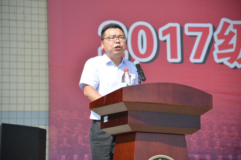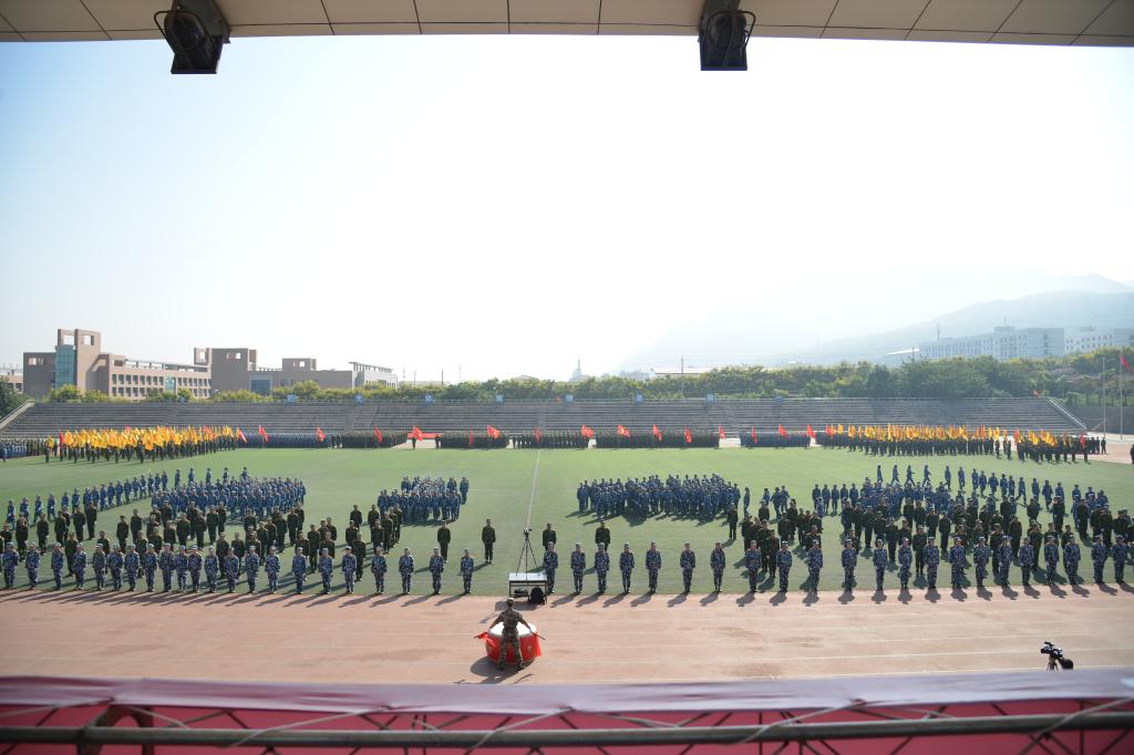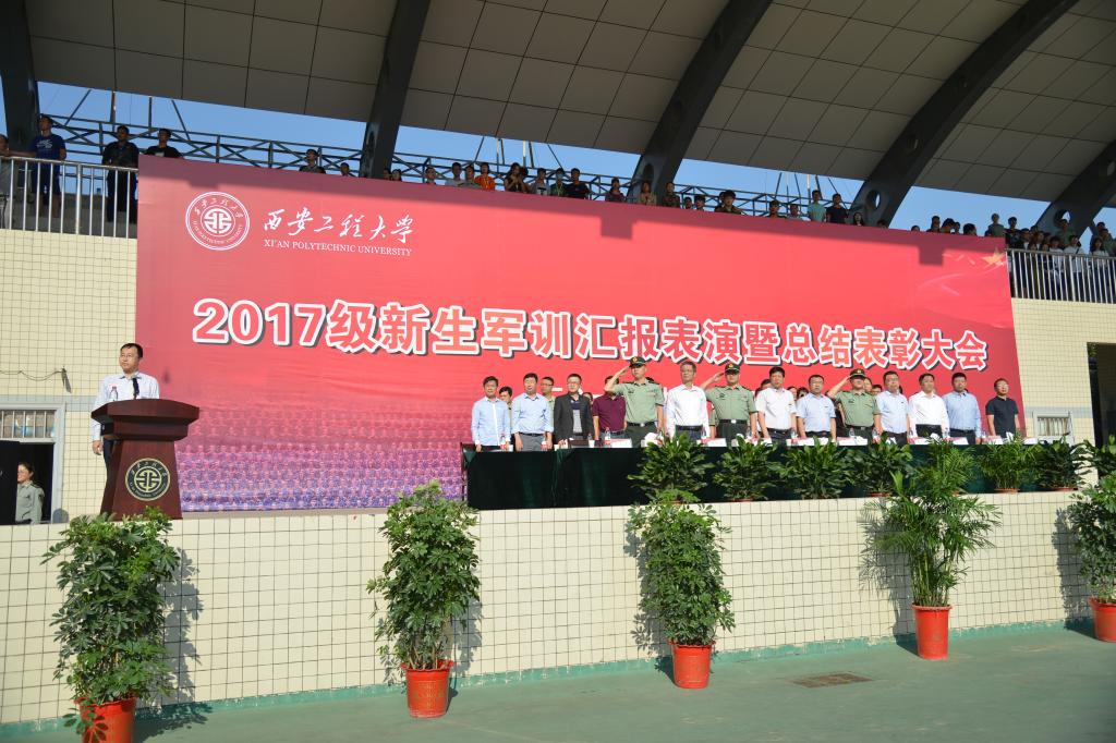 金秋九月,丹桂飘香;骊山脚下,军旗招展。9月13日上午,我校2017级新生军训汇报表演暨总结表彰大会在临潼校区东环体育场隆重举行。中国人民解放军陆军边海防学院教研部政委刘建斌大校、军训教研室主任刘法语上校、安全管理处参谋李轩中校,我校领导高岭、李博飞、赵小峰、黄翔、樊增禄、朱永民、黄新波,校长助理汪义瑞出席大会,校国防教育暨学生军训工作领导小组各成员单位负责人、各学院(部)院长、党委(总支)书记、学生工作主管、机关相关部门负责人、全体参训教官和2017级新生4800余人参加了大会。黄新波主持大会。