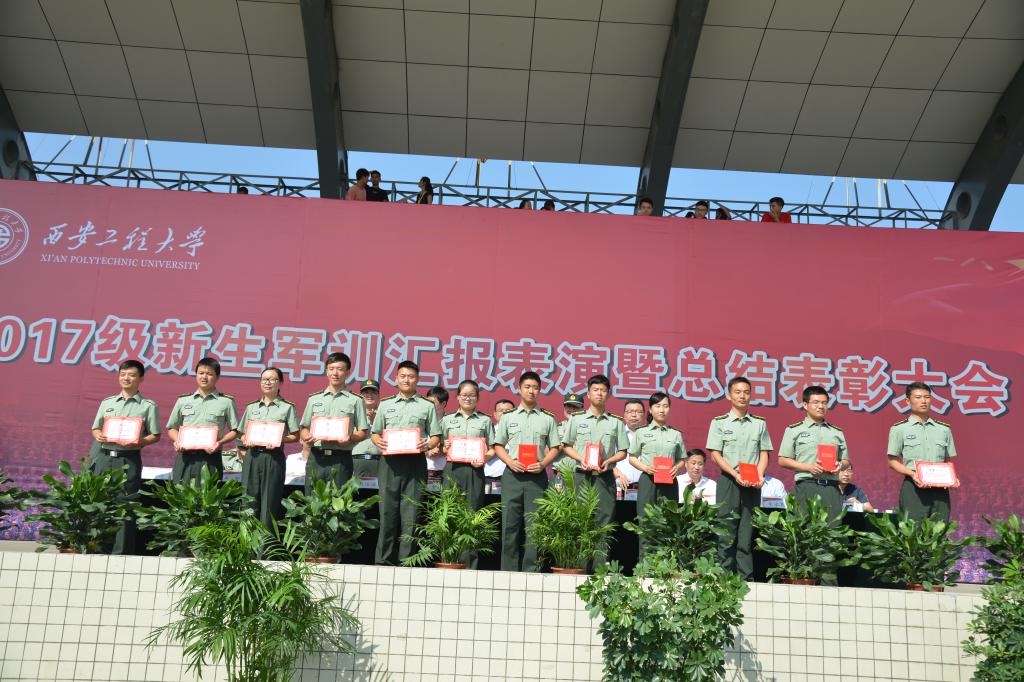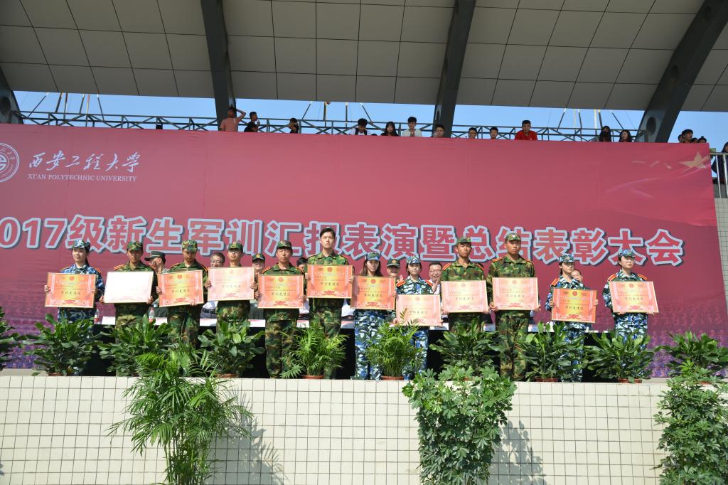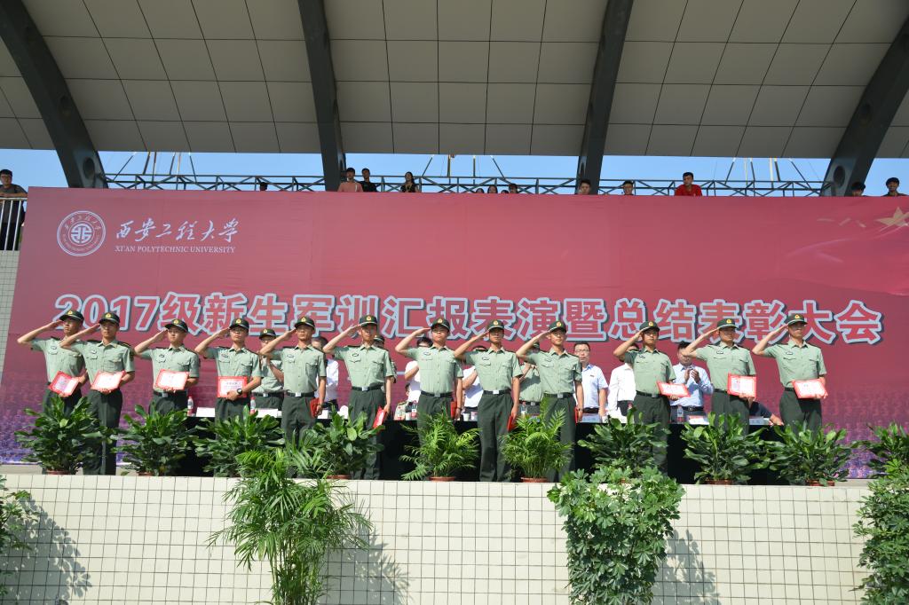 在庄严的升国旗、迎军旗后,军训汇报表演正式开始,我校校长、国防教育暨军训工作领导小组组长高岭检阅了学生各团军训方队,同学们以标准的军姿、饱满的热情、嘹亮的口号接受了检阅。随后,军训各类训练科目进行了展演,气势磅礴的军体拳,整齐划一的捕俘刀,青春洋溢的韵律操,威武霸气的应急棍术和舞旗,接近实战效果的特战行动和防灾综合演练赢得了全场经久不息的掌声。而舞旗和队列表演更是精彩不断,随着队形变换,参演方队摆出了“1912-2017”、“XPU”和“西工程大”等字样,引起了现场阵阵喝彩。