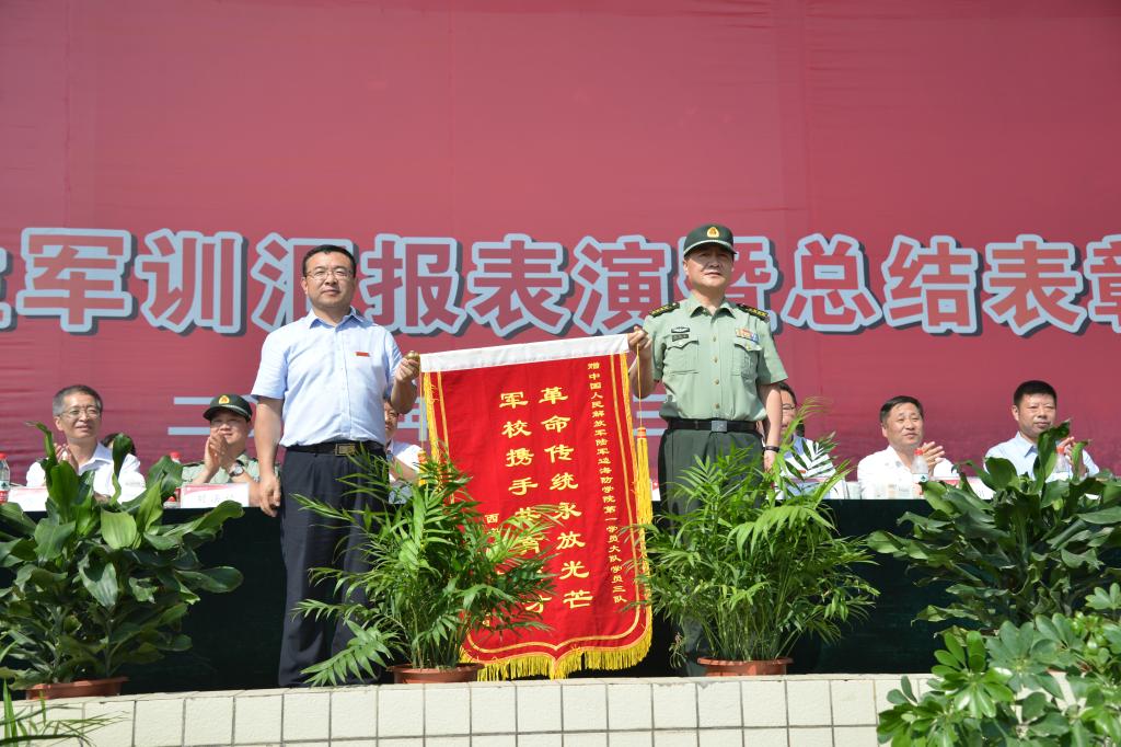 汇报表演结束后,校党委副书记李博飞宣读了表彰2017级学生军训先进单位及个人的决定,与会领导共同为先进集体和个人颁奖。高岭向承训部队赠送了锦旗,感谢陆军边海防学院对我校军训工作的大力支持,刘建斌代表该学院接旗。随后,军训师11团团长冉黎斌和7团人文社会科学学院张朔同学分别代表全体承训教官和受训学生进行了发言。