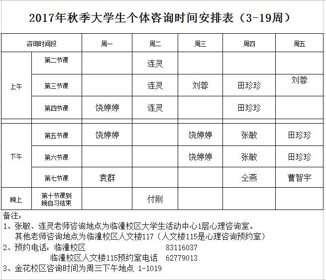 根据我校学生心理咨询工作的需要,现将有关个体咨询时间安排如下,请各学院及时通知学生,在规定时间内预约咨询。