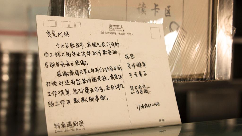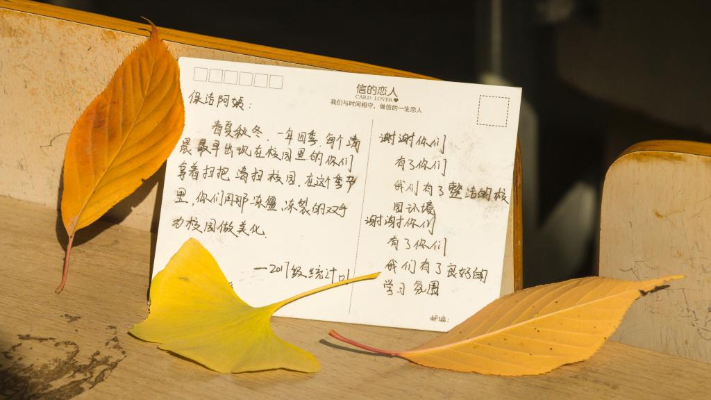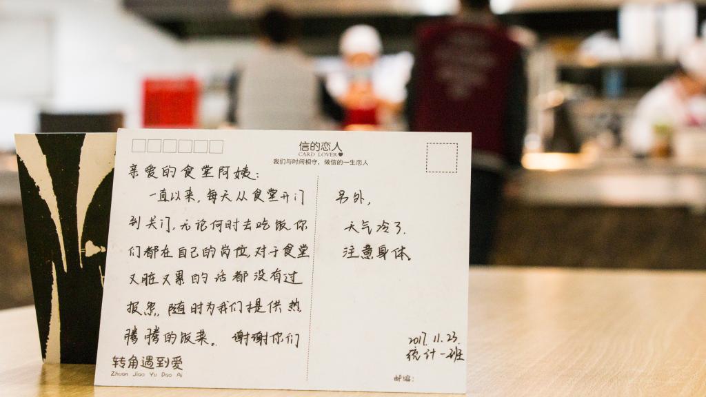 【感恩融入四季,工程大学子冬日添温暖】春寒料峭,依旧生命复苏,如宿管阿姨般柔和坚定,我们也需报得三春晖的感恩;夏日炎炎,依旧心静情凉,如保安大叔般深沉和宁静,别忘记羊跪乳的孝心;秋叶悬落,依旧硕果累累,如老师般辛苦和执着,我们要献给老师知识的合集;冬梅含苞,依旧迎接寒霜,就像那清洁工人游走于凛冽寒风,他们是无私的代名词。这个感恩节,西安工程大学理学院2017级孩子们,用心书写了一张张明信片,送往平日里默默付出的学校后勤人员。