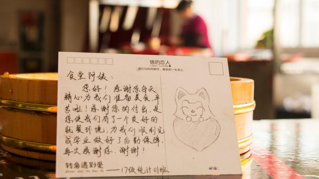一直以来,每天从食堂开门到关门,无论何时去吃饭,你们都在自己的岗位,对于食堂又脏又累的活都没有过抱怨,随时为我们提供热腾腾的饭菜,谢谢你们!另外,天气冷了,多注意身体!