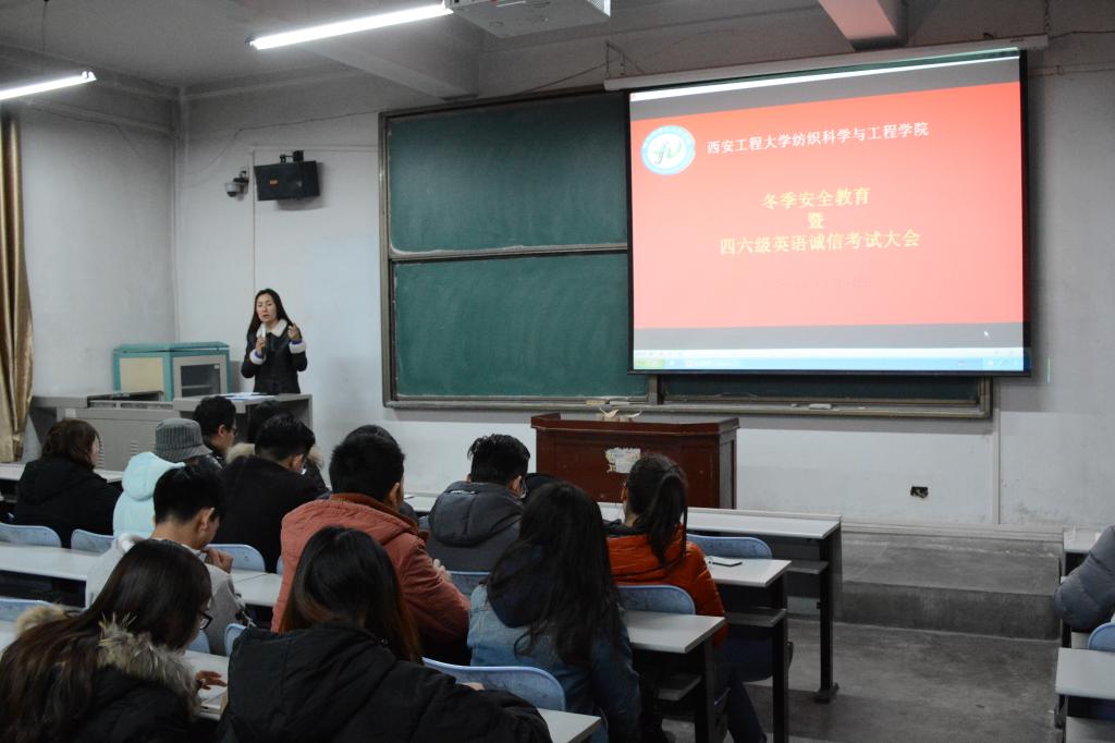 2017年12月14日,纺织科学与工程学院举办冬季安全教育暨四六级英语诚信考试大会在西安工程大学金花校区教学主楼623教室举行。出席本次大会的嘉宾有纺织科学与工程学院副党委书记郭西平、学生工作办公室主任赵勇进和团总支书记付成程,研究生会干部干事、团学科学生干部、各年级班委与全体学生宿舍舍长参加了此次大会。